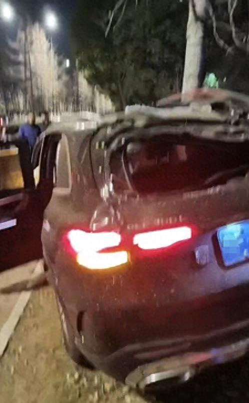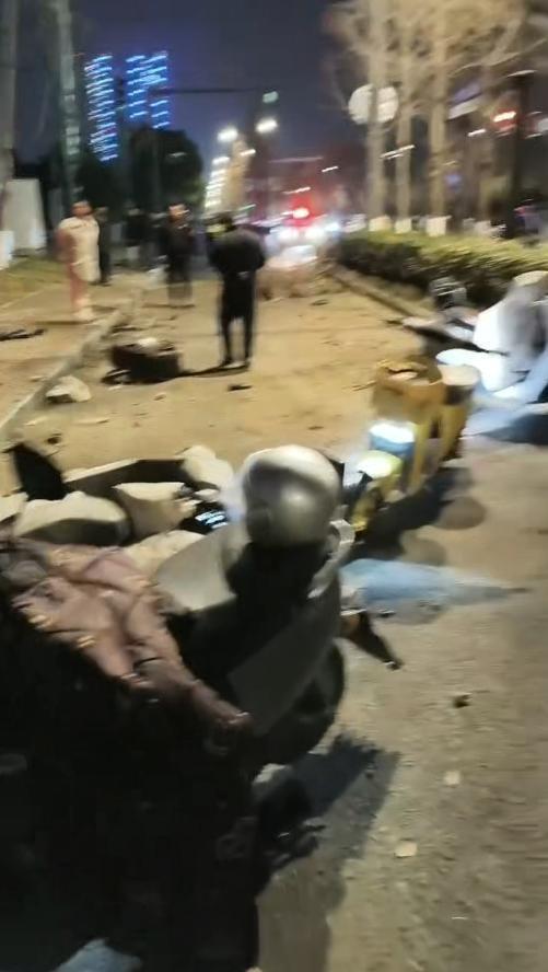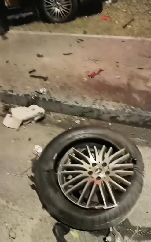 视频里能看到,慢行道上有至辆两轮车倒地,SUV冲上人行道,疑似撞倒一棵树。车的安全气囊打开了,受损严重,轮毂都甩到慢行道。